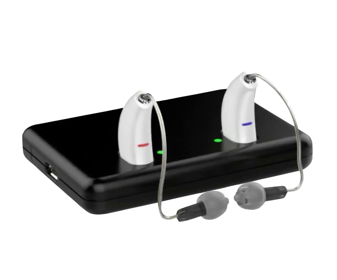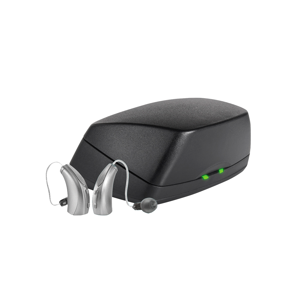 Los audífonos recargables, o también conocidos como audífonos sin pila, tienen pilas incorporadas que no requieren una extracción periódica, en comparación con los audífonos con pilas desechables tradicionales. En lugar de extraer las pilas, el usuario acopla los audífonos cada noche a una unidad de carga, de forma similar a como se recargan los smartphones.